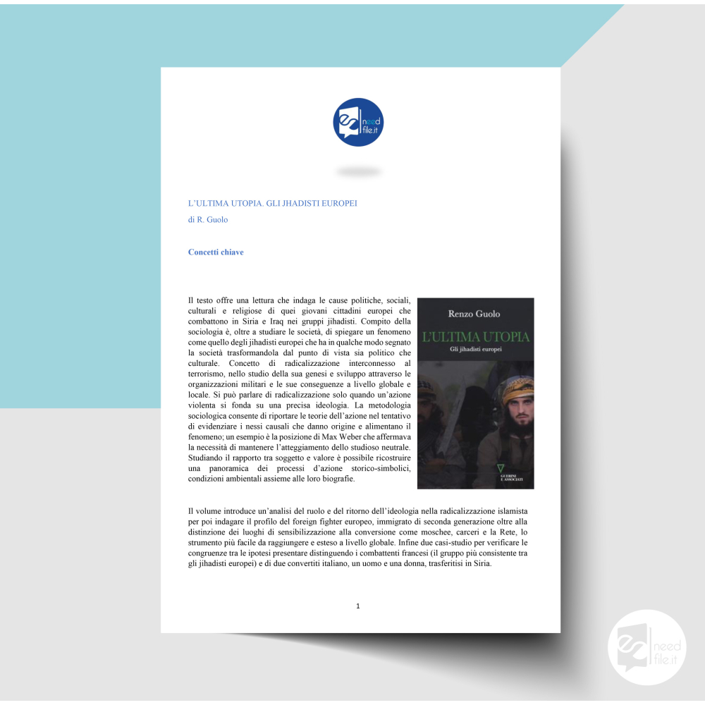 Concetti del libro "L'ultima utopia" di Guolo che indaga cause politico, sociali, culturali e religiose dei giovani cittadini europei che combattono in Siria e Iraq nei gruppi jihadisti. Il volume introduce un'analisi del ruolo e del ritorno dell'ideologia nella radicalizzazione islamista per arrivare al profilo dei foreign fighters, immigrati di seconda generazione.