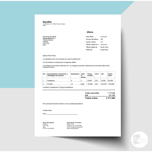 Modello di facile compilazione per calcolo offerta con elenco di prodotti e prezzi da rilasciare ai propri clienti.
