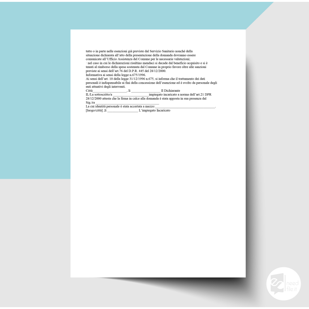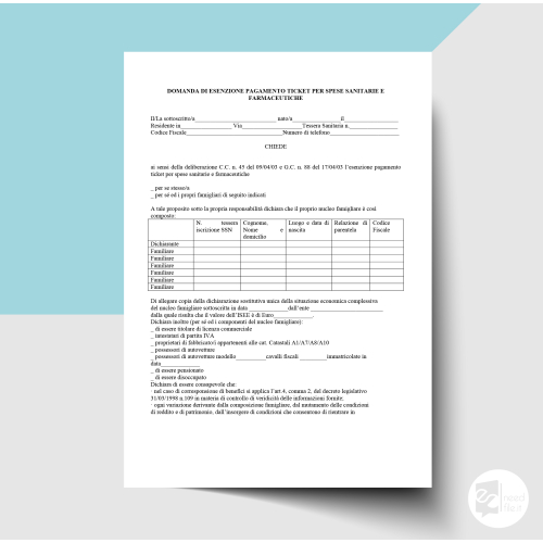 Modello con domanda di esenzione pagamento ticket per spese sanitarie o farmaceutiche.