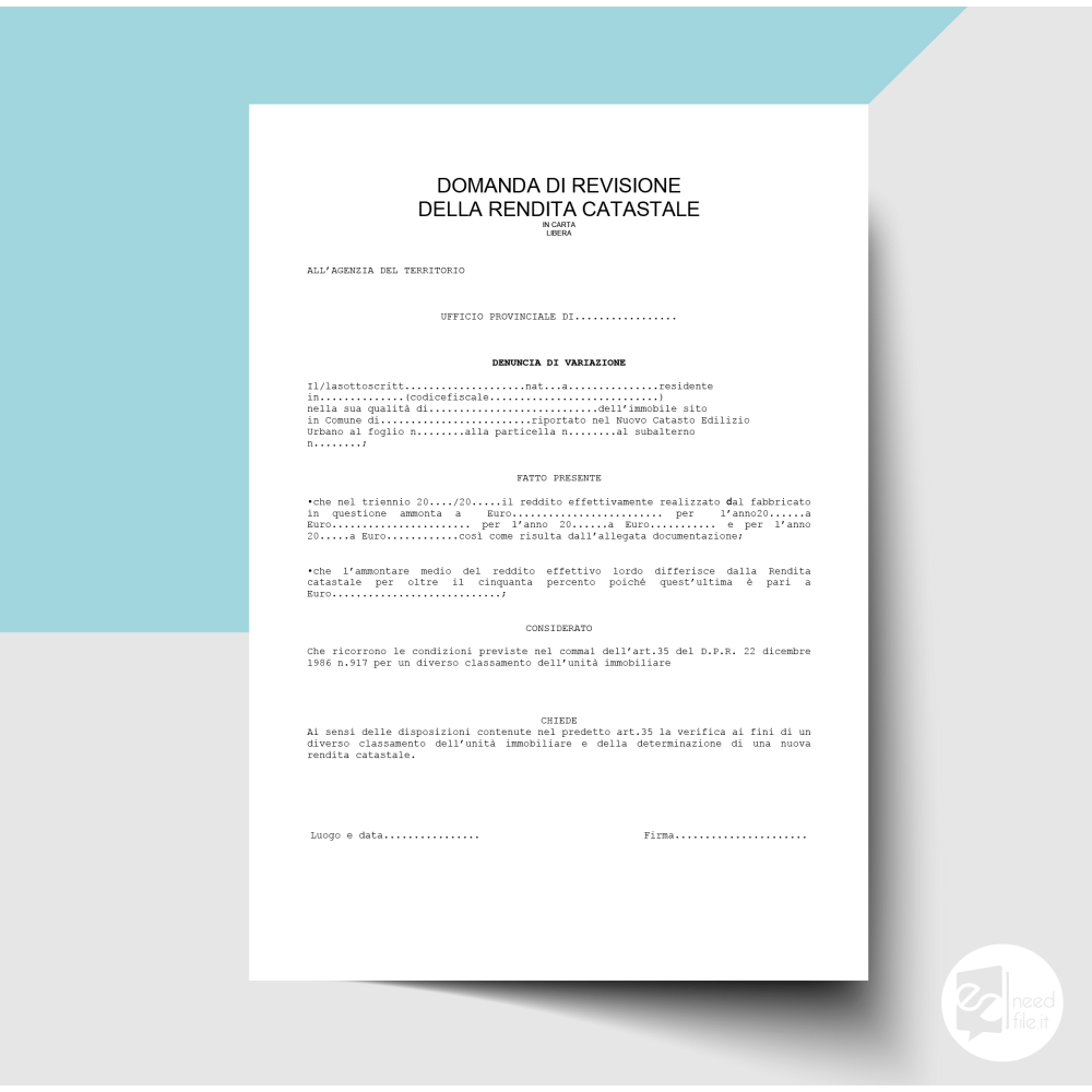 Domanda di revisione della rendita catastale in carta libera per denuncia di variazione.