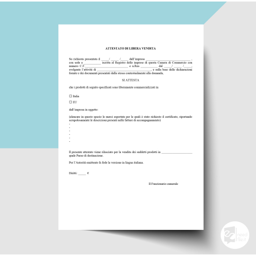 Modello di facile compilazione per attestato di vendita merci, idoneo all'Italia e paesi europei. Indicare nella prima parte l'anagrafica, elenco delle merci di cui è stato chiesto il certificato e il paese di destinazione.