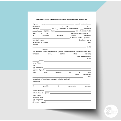 Modello di facile compilazione per la richiesta di concessione della pensione di invalidità dove indicare i dati della persona e il relativo stato di salute con cartelle cliniche, accertamenti sanitari oltre ad eventuali terapie praticate.